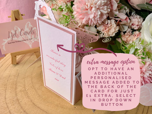 from 1363 reviewsI have bought this card before and again for a wedding. It is beautiful and I will be buying it again for another wedding next year. You can have a background colour that matches the bridesmaids dresses. The theme was black and I asked for a white bow on the front which ljd obli